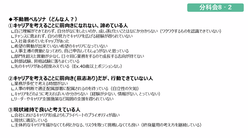――ありがとうございます。他の分科会は「個人の不動層を変える」といったことをターゲットにしていますので、この分科会は「他人にどう影響を与えていくか」という視点を持っています。たとえば、キャリアオーナーシップに対して非協力的だけれども、他人のキャリアオーナーシップへ悪影響を及ぼさない方もいれば、他の方のキャリアオーナーシップを押しとどめる方もいる。それを明らかにしたいですね。