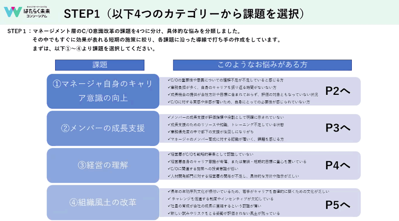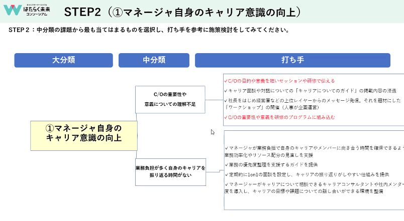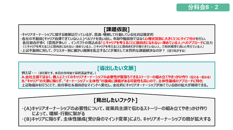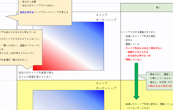 では、こういった方がどうしたらキャリアオーナーシップに対して前向きになるのだろう、と対応策を実施していくところがゴールだと話していました。こんな進め方ですが、いかがでしょうか。