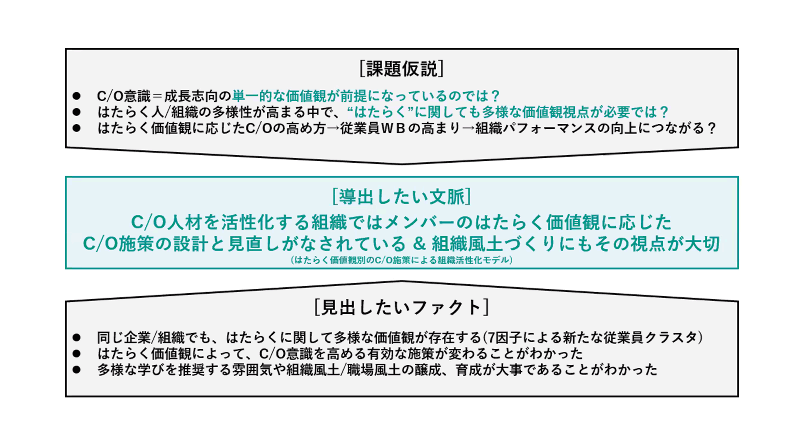 私たちもキャリアオーナーシップ人材を活かせる組織論について考えており、仮説、見出したいファクト、導入したい文脈についてそれぞれ議論をしてきました。そのうえで、あまり個別にケーススタディをやりすぎると、各社のやり方を議論しているだけになっていないか? という疑問がありましたので、より大きな提言、まとめを出したいと考えています。