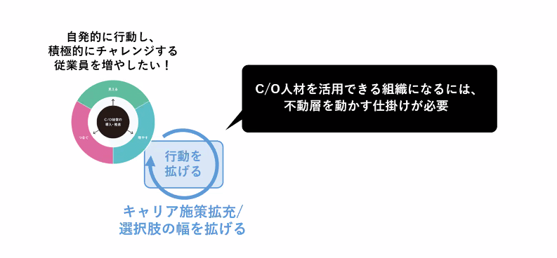 これまでの調査の結果、「やはり」というところではありますが、施策を打っても不動層はなかなか動かないことが明らかになりました。そこで、キャリアオーナーシップという言葉と矛盾するようではありますが、ある程度の強制力を用いてキャリアオーナーシップを育てられないか、打ち手を考えたいと思います。