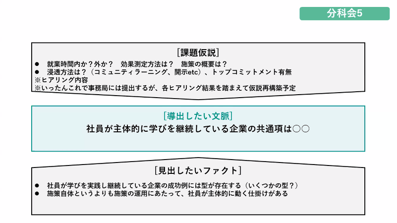 リスキリングについて、「社員が主体的に学びを見出している企業の共通項は〇〇」と言える結果を出せるよう、各企業でヒアリングを実施しています。今日はそれぞれがヒアリングしてきたデータを持ち寄って、最終的なアウトプットの形を決めていくつもりです。