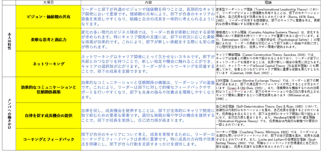 ――チームで、進め方についてはおおむね合意しました。まずは、タナケン先生のフィードバックをもとに「キャリアオーナーシップを持ちやすいコミュニケーションの取り方」について、背景となる学術理論を踏まえて6つにまとめました。