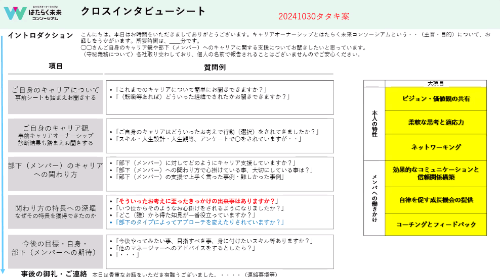 インタビューは「質問をもとに何を抽出したいか」をもとに質問を考えるとよいですよ。これを経て何を得たいですか。キャリアオーナーシップへ踏み出すための一歩に必要なキーワードを知りたいのか、それともエピソードを得たいのか。