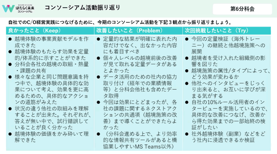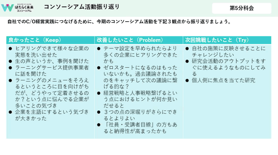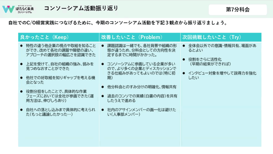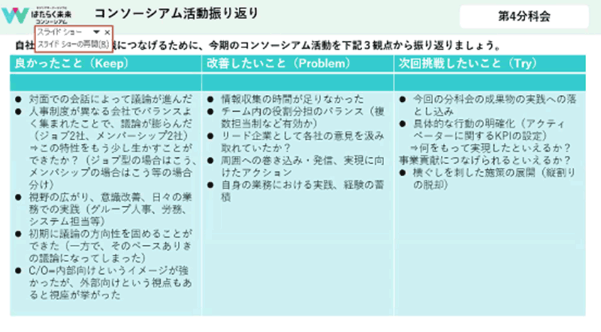 私たちは、対面での会話で議論が進んだと感じています。人事制度が異なる会社でバランスよく集まれたことにより、議論が膨らみました。参画企業同士の意識改善も進んだと思います。
