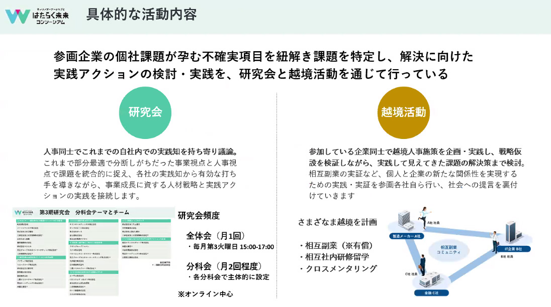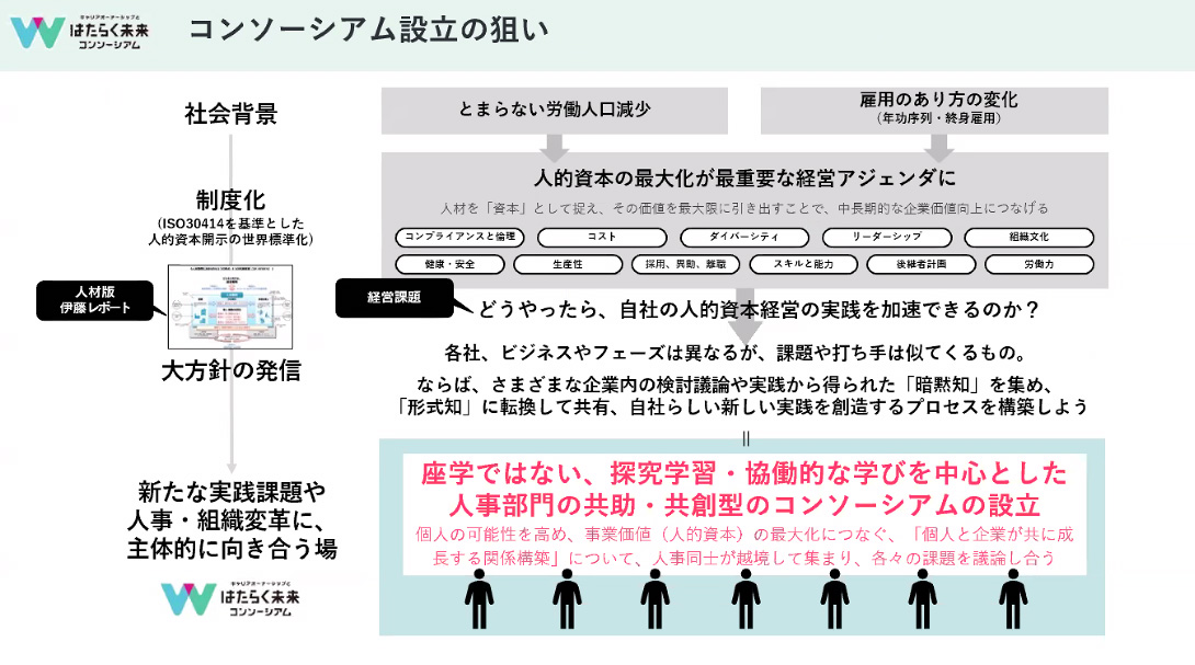 人的資本経営がアジェンダになったうえで、どうやったらいいのか。これを座学ではなく探求学習、共同的な学びを中心として、人事部門のみなさまが集まって実践方法を検討していくのが、本コンソーシアムの目的です。得られた知見は白書などで、参加いただいてない方々にも情報発信をしてまいります。