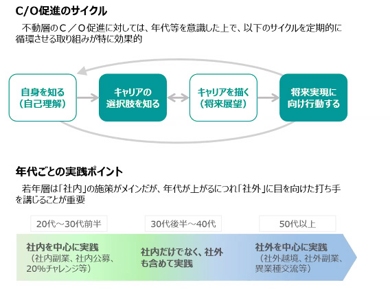 - 年代ごとに施策が分かれる:若手は社内向け、ベテランは社外へ目を向けた打ち手が重要