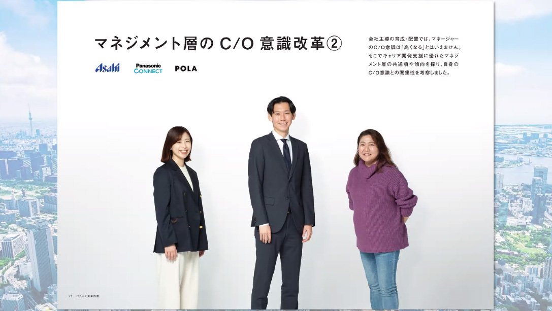 私たちは、マネジメント層のキャリアオーナーシップ育成の課題に触れていきました。われわれは、アサヒグループ、そしてパナソニックコネクト、ポーラ、3社で研究を進めてまいりました。私たちは企業の競争力と生産性高めるために、経営者と社員をつなぐマネージャー自身のキャリアオーナーシップ意識の情勢が不可欠だと課題意識を持っていました。