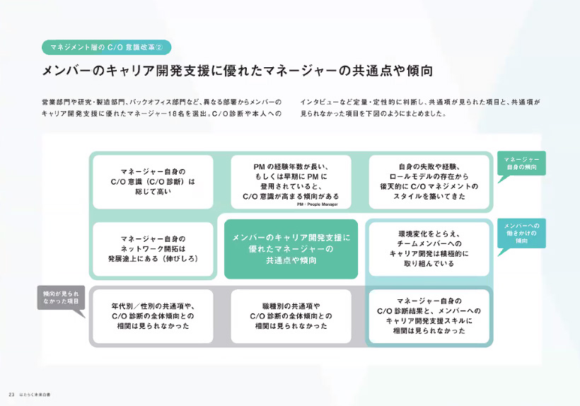現状を見ると、たとえばマネージャー自身のネットワーキングには非常に伸びしろがあるという課題も見えてきまして。自分自身のネットワーク行動が遅れがちだと発せられるマネージャーの方も多くいました。メンバーへのアドバイスはできる優秀なマネージャーが多いのですけども、自分自身が行動に出ているかというと、なかなか……という現状や、「年代や性別、職種に相関がない」ことがわかりました。