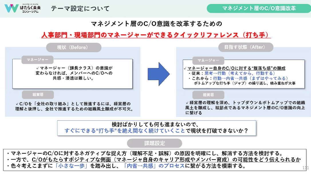 このテーマを選んだ理由としては、キャリアオーナーシップ推進を考えたときに、経営層とメンバーの結節点であるマネジメント層、課長クラスに目を向けたからです。