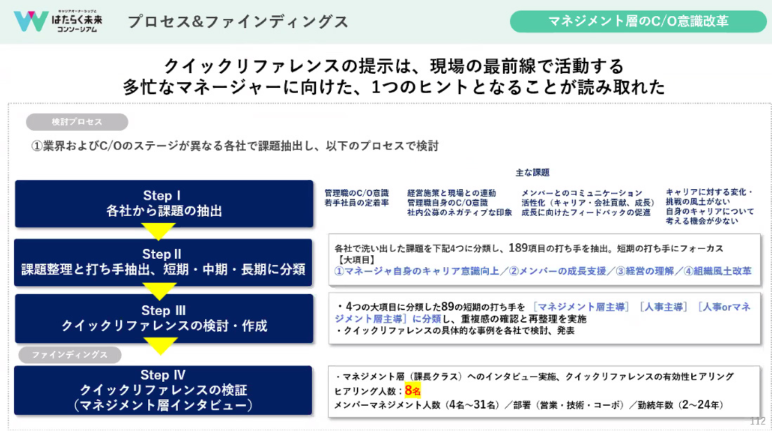 上図のステップで、打ち手を検討してまいりました。そのうえで、189の打ち手のうち、89種の短期で使えるものを選別しました。さらにそれを「マネジメント層・人事・双方」に分類し、クイックリファレンスを作成しました。さらに、白書では各社の事例も資料としておつけしました。