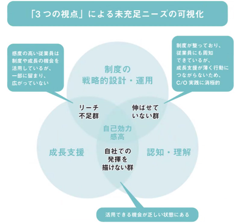 「3つの視点」から自社課題を明らかにしました。たとえば、「1.制度の戦略的設計・運用」においては施策が乱れ打ちになっていないか。認知・理解においては興味関心が抱けない施策の見せ方をしていないか? などを明らかにしました。