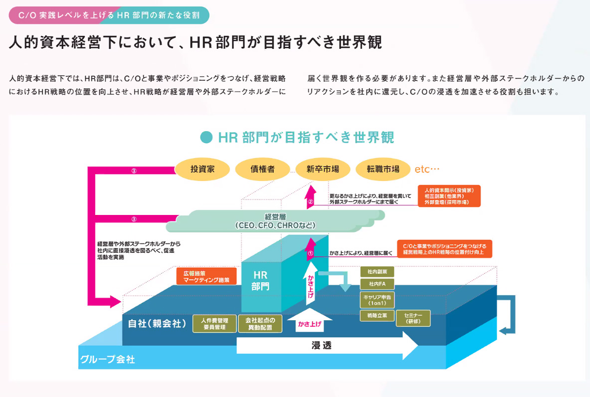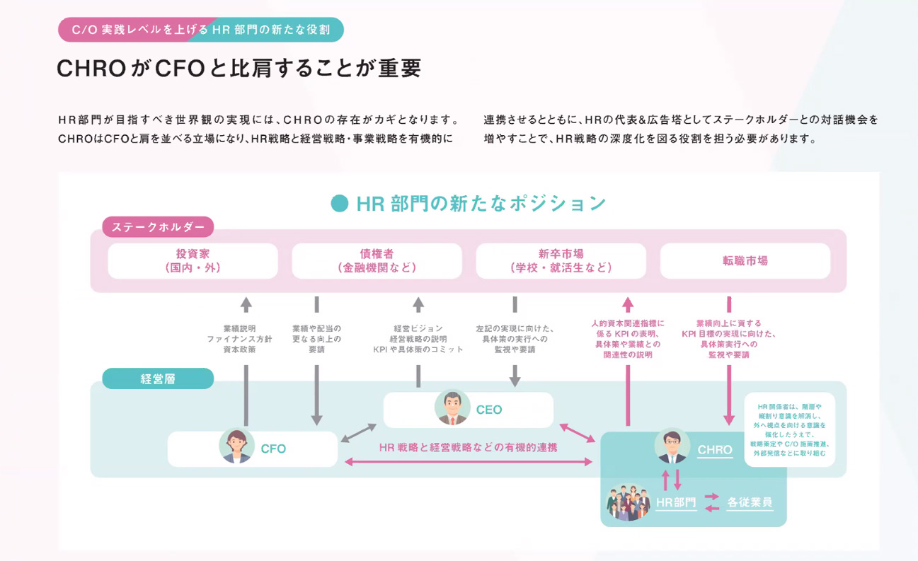 この世界観を実現するためには、CHROが広告塔として他のステークホルダーとのアプローチが必要となります。資本市場で人的資本経営が重視される現在は、CHROがCFOと比肩し、有機的に連携することがいっそう重要であると考えます。そして、CHROは組織外・社外へ目を向け、外部発信へも積極的に取り組みます。