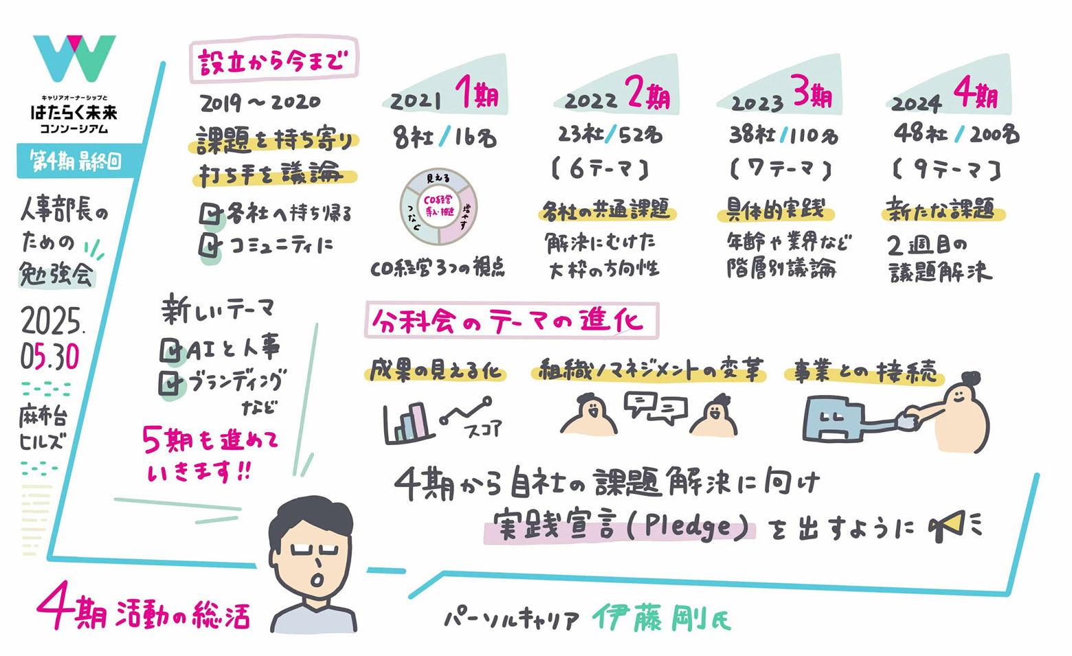 特に第4期は「キャリアオーナーシップと事業貢献の関連性」「不動層とはどういった方々で、いかに共存しうるか」「越境体験はどうすれば事業成長へつながるか」「マネジメント層のキャリアオーナーシップ」「人事と他部署の接続」などに関する議論が、活発に行われました。