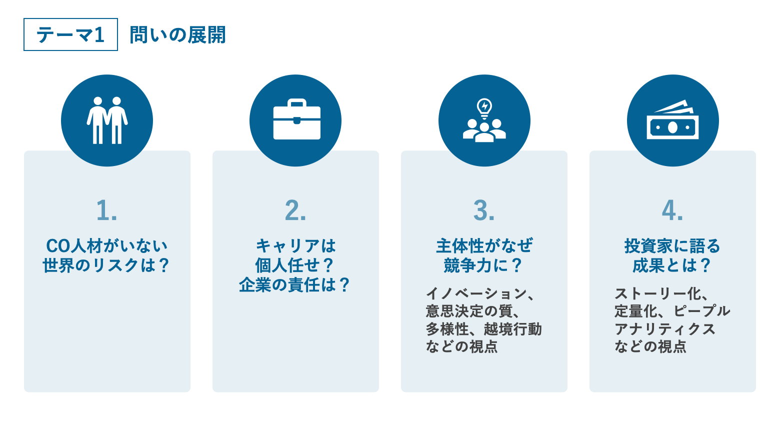 コンソーシアムが生まれた当初は「キャリアオーナーシップ経営の提言」という、抽象度が高いテーマで議論を始めましたが、期を重ねるにつれて、以下の4つに論点が絞られました。