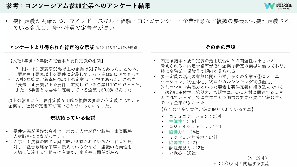 こちらがアンケートの分析結果です。要件定義が明確な企業は、新卒の定着率が高いことがわかっています。そのためにも、人事と面接官で要件定義が共有されていること、そして新入社員に経営戦略を丁寧に伝えているかどうかが関係すると仮説を立てています。