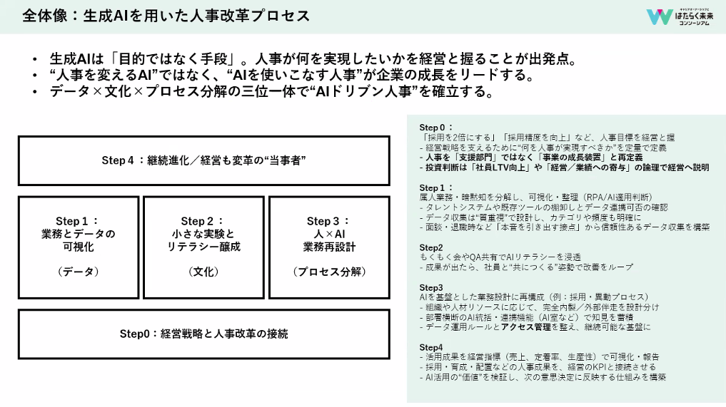 生成AIを活用する手段について、作ったプロセスがこちらです。今回特に永島さんへ伺いたいのは、Step0にあたる「経営戦略と人事改革を接続させる」方法です。DXや生成AIの活用がうまくいっている企業では、そもそも人事がどうありたいかのゴール設定を経営層と握っていることが多く、この合意のあるなしで施策の推進力が大きく変わる認識です。