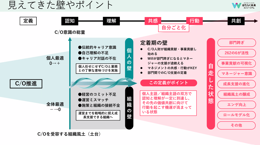たとえば、工場や営業所などを多く抱える企業では、マニュアルが優先されてキャリアオーナーシップ人材の重要性が行動にまで及ばないことが多々あります。また、キャリアオーナーシップ支援施策が個人に向けられすぎており、制度として運用・浸透できていないのではないかといった課題についても明らかとなりました。