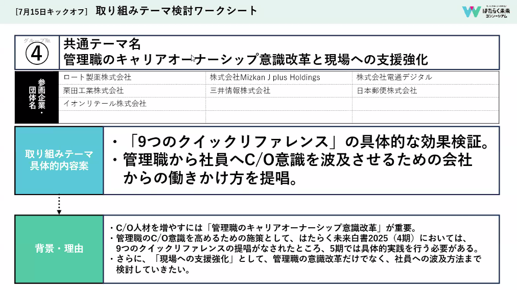 私たちは、第4期で提唱された9つのクイックリファレンスの効果検証と、管理職からメンバーへキャリアオーナーシップ意識を波及させるための会社からの支援を考えています。