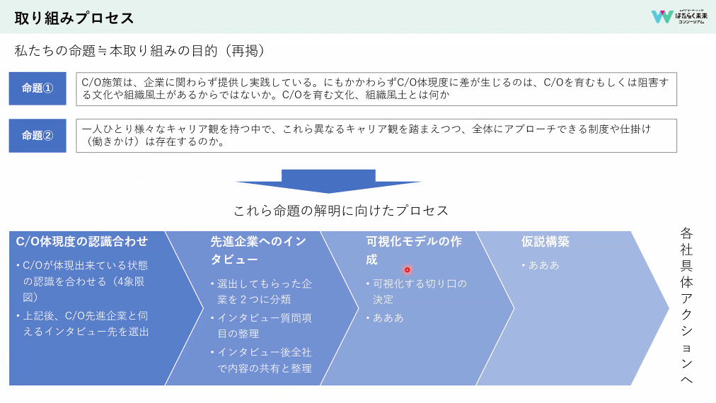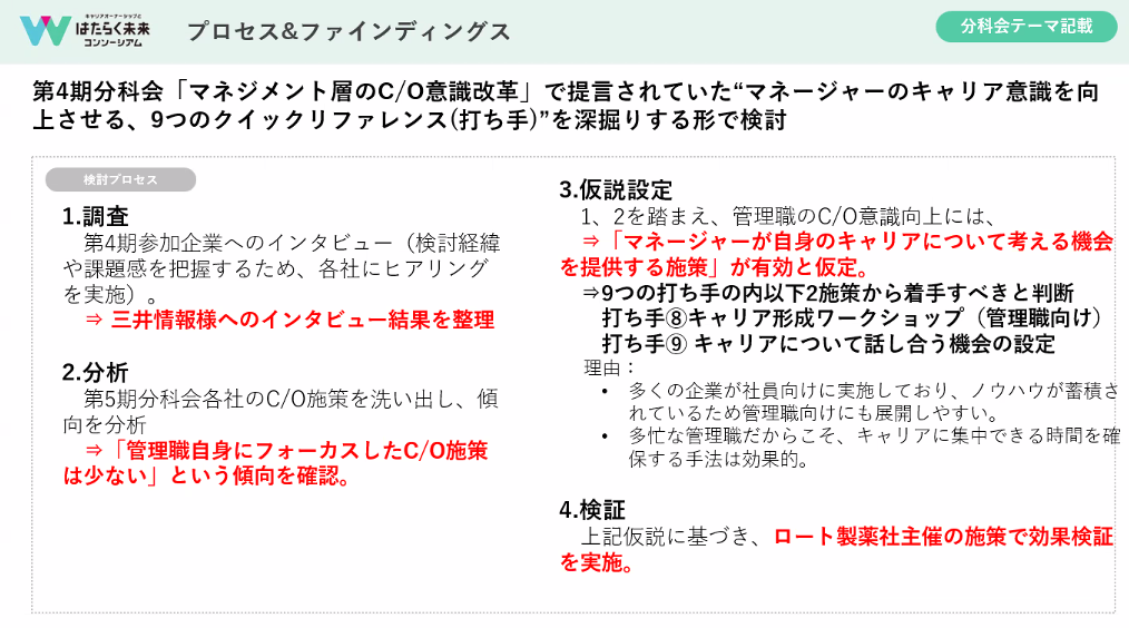 具体的には、昨年度の参画企業である三井情報さんのお力をいただき、ヒアリング調査を実施しています。そして、打ち手のうちの2つにある「管理職向けキャリア形成ワークショップ」「キャリアについて話し合う機会の設定」をロート製薬株式会社さんで実施していただき、効果検証を行っていく流れです。