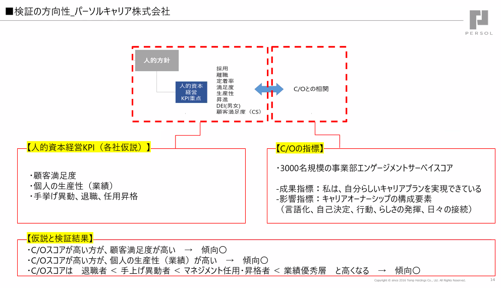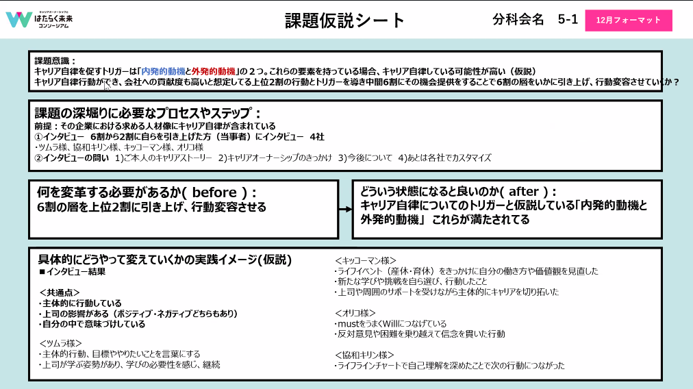 現状ではインタビューを実施しています。対象者は「6割の人材を上位2割に引き上げた」事例を持つ方を対象に、数社で実施しています。ご本人のキャリアストーリー、キャリアオーナーシップが生まれたきっかけなどをヒアリングすることで、成功事例に学ぶ方法を考えています。