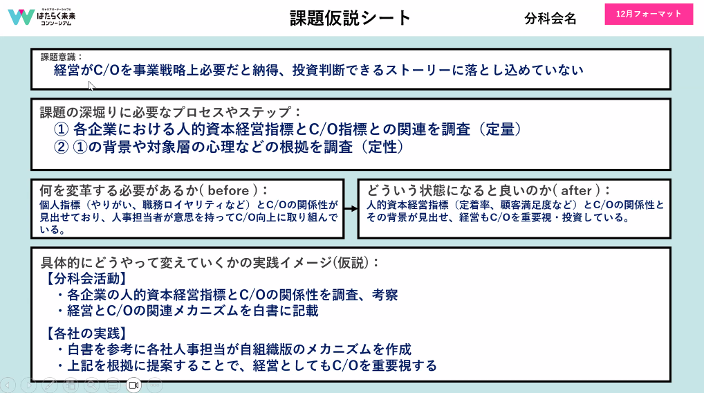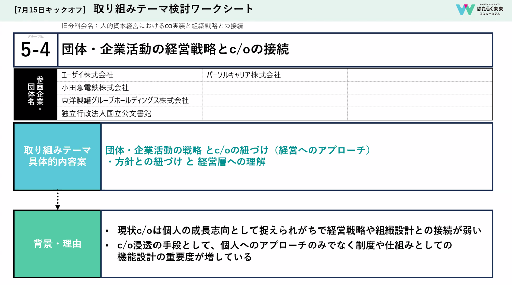 単純にキャリアオーナーシップを上げるというだけでなく、新たな問題提起に分科会の活動がつながればと思います。ぜひ、役員をうならせてください。