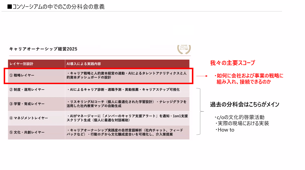 私たちは、キャリアオーナーシップを数年推進した後「2周目の課題」に向き合って議論しました。いわゆる2:6:2のうち「6割の人を動かす」にはどうすればいいのか。その打ち手を各社で議論し、キャリアオーナーシップ経営を次のステージへ加速させたい狙いです。