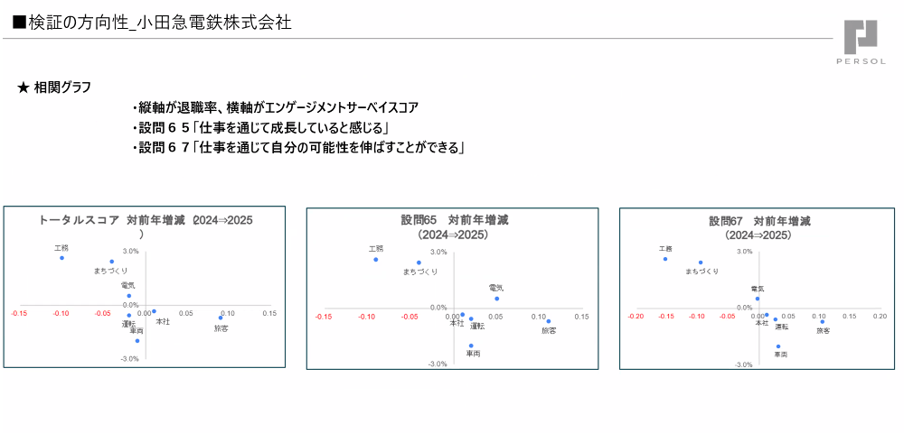 人的資本経営を進めるうえでのKPIで最も重要なのは退職率であろうと考え、キャリアオーナーシップとの連動性を見ていきたいと考えています。キャリアオーナーシップの指標としては、エンゲージメントサーベイの中のキャリアオーナーシップに関する項目を抽出しました。検証結果としては、エンゲージメントサーベイのキャリアオーナーシップに関するスコアと、退職率には負の相関があることがわかっています。