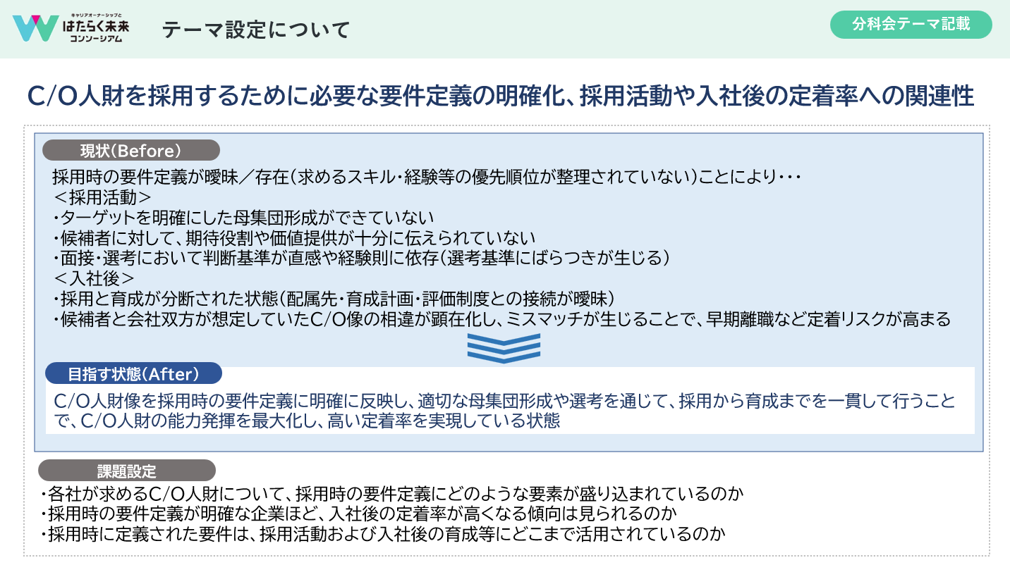 第1分科会では、キャリアオーナーシップ人材を採用するために必要な要件定義を明確化するための議論を深めました。私たちは「なんとなく」で人材を採用してしまった結果、定着率に課題が生じてしまっています。そこで採用の定義を明確化し、入社後のマッチング、定着率上昇を目指したいと考えました。
