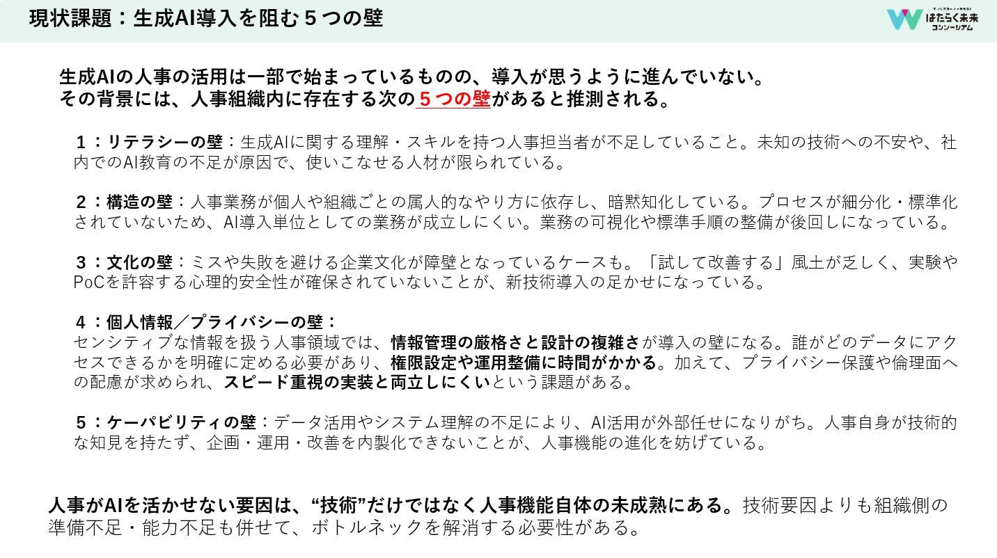 そして、生成AIを導入するうえで発生する5つの壁を明確にしました。