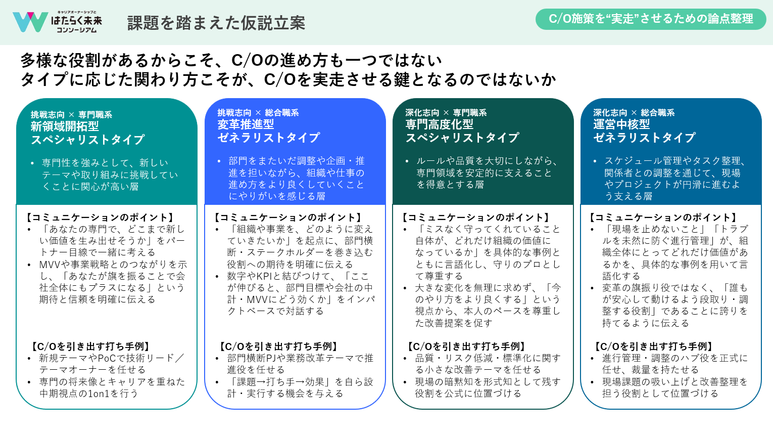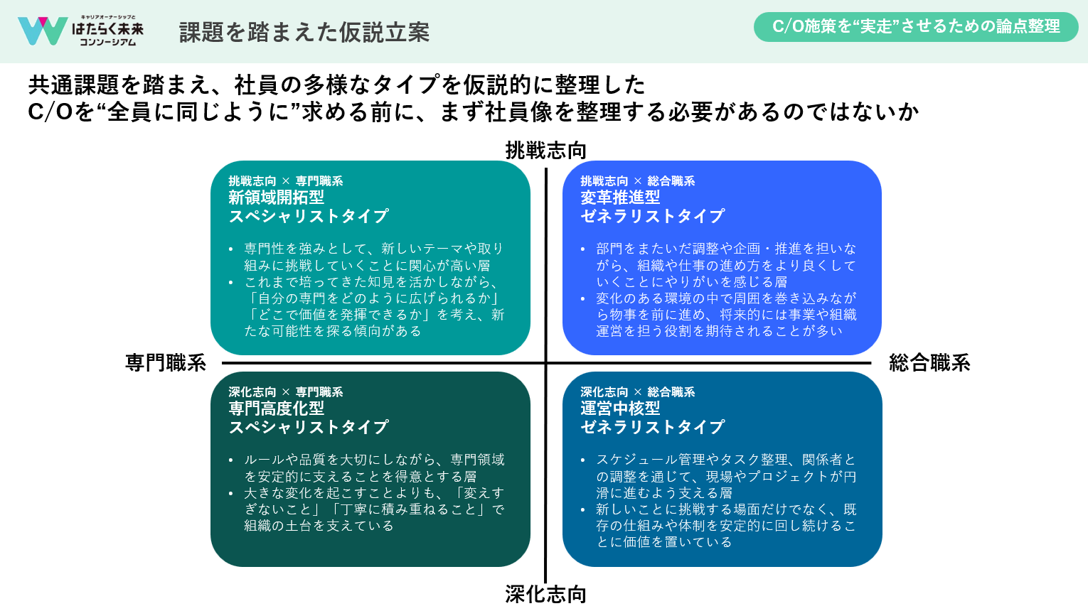 そのうえで、社員を一方的にくくって課題を語るのは難しいのではないかと考えました。そこで、社員を4職種に分類しています。