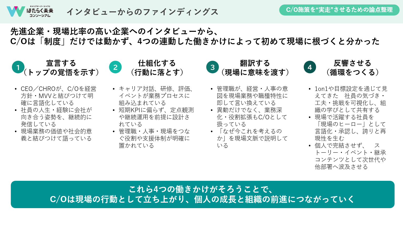特に4つのポイントを総括すると、経営・人事・現場の相互作用があって初めてキャリアオーナーシップ経営が実現できることが見えてきました。