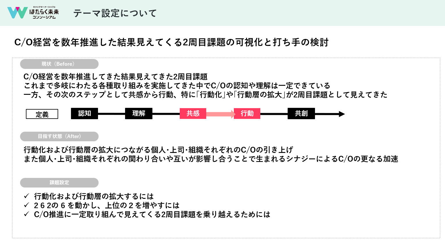 当初はキャリアオーナーシップ推進に向けた一周目企業が直面する壁について取り扱う予定でしたが、その後、施策が回らない壁と、実装させるための対策を考える方向へテーマを変更いたしました。