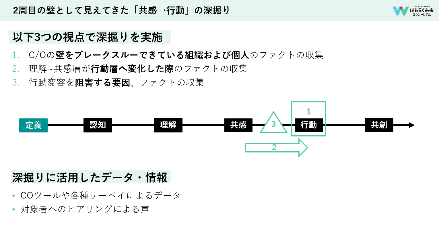 そこで、行動を促進している要因と、阻害している要因を定量・定性で分析しました。行動は個人の力だけでは生まれず、相互連携が必要であると考えました。