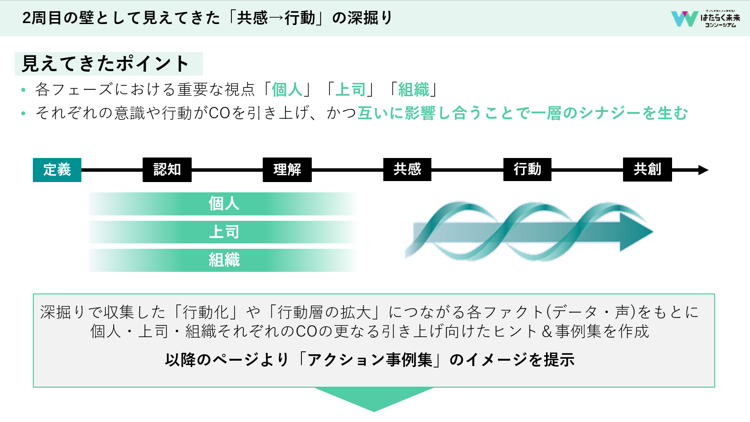 ―とても分かりやすいプレゼンをありがとうございます。組織・上司・個人が相まって初めて行動が起きるというのは、非常にキャッチーであり、同時にその通りだと思いました。さらに分析だけでなく、どういったアクションを起こすべきかを明確にしていただけたので、「やらなくてはならない」から「どうすればいいか」が具体化されたかと思います。