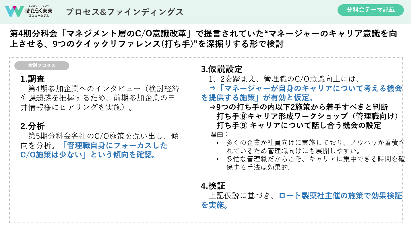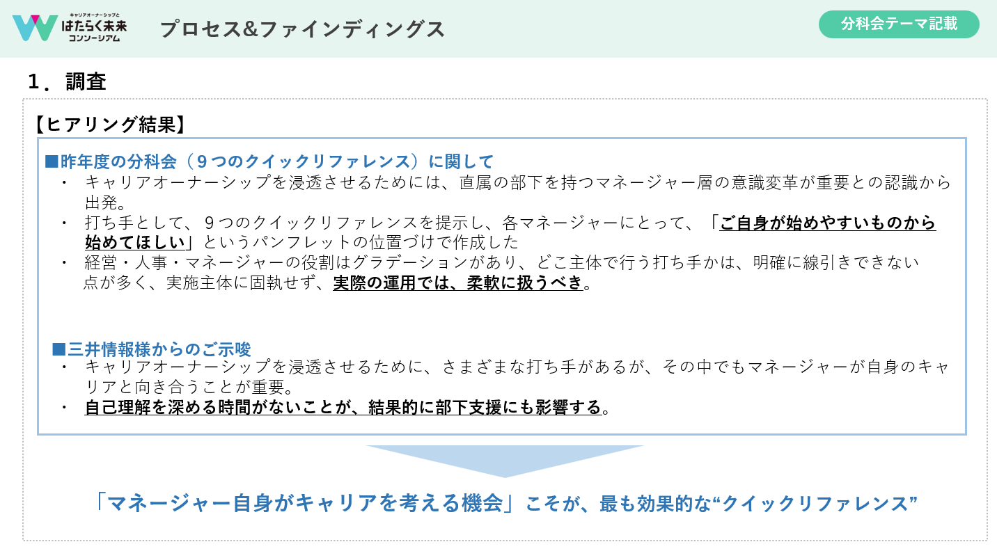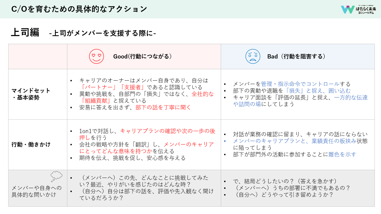 各社調査を実施したところ、クイックリファレンスにおいてもメンバーへはキャリアオーナーシップ支援をしていても、マネジメント層へはアプローチできていないことが共通項として挙げられました。そのうえで、9つ示されたクイックリファレンスの中でも「マネージャー向けのワークショップ」「キャリアについて話し合う機会を設ける」という2つの施策を実施しました。