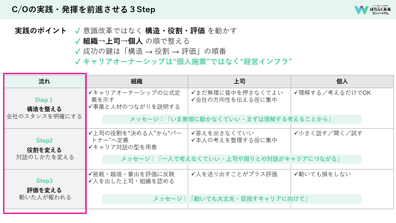 そのうえで、最後にキャリアオーナーシップの実践を推進する3つのステップをご案内します。組織の面では、まず会社のスタンスを明確に、キャリアオーナーシップの公式定義を示すこと。そして、上司の役割を決める方から「パートナー」へ定義すること。そして挑戦・越境・輩出を評価に反映すること。この順番で整えていけば、キャリアオーナーシップ経営への共感は行動に変わると考えています。