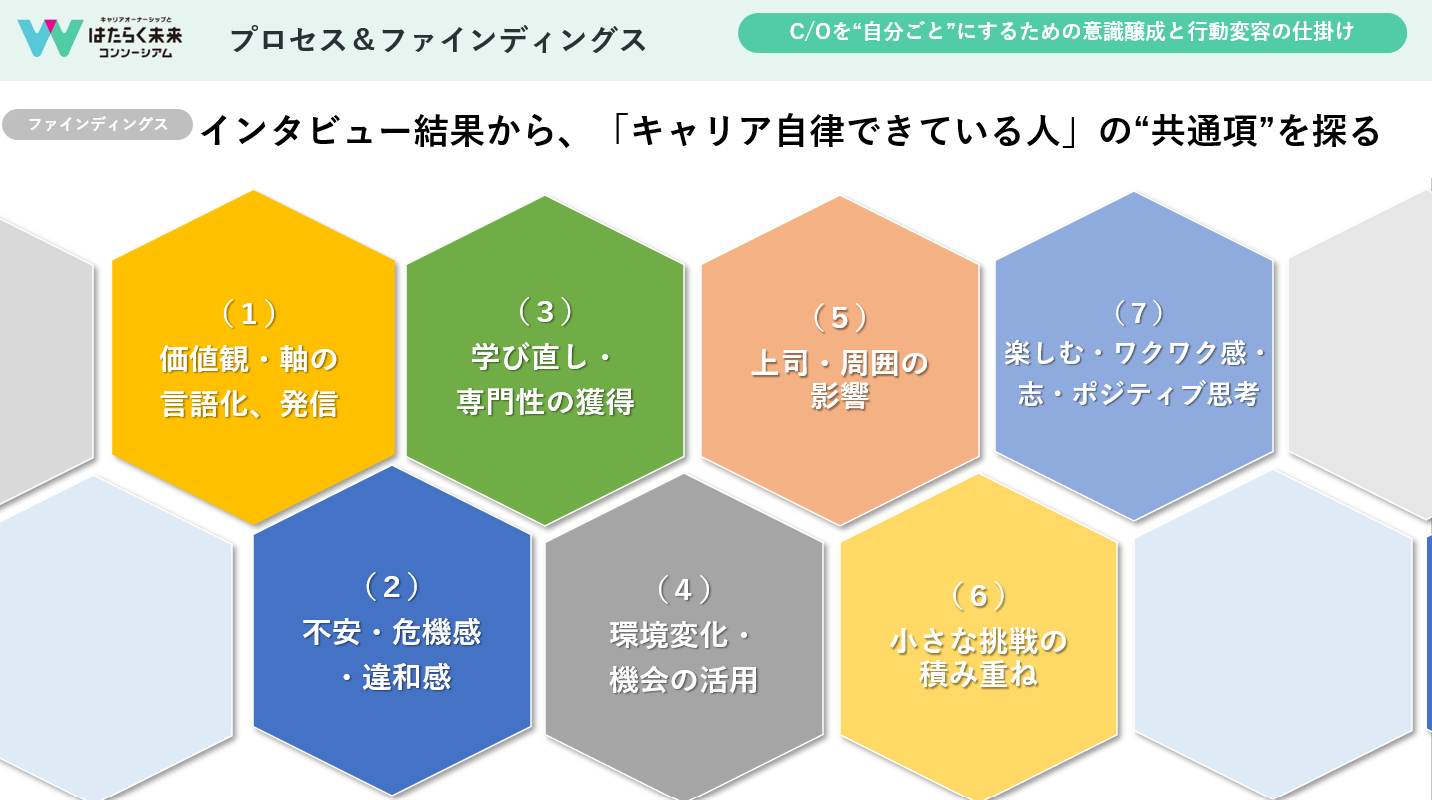 4名へのインタビューを通じて判明した「キャリア自律できている人」の共通点は、上図にまとめた7つが見つかりました。これらをご覧いただくことで、ご自身の組織で強い部分や、さらに強化できる部分を見ていただき、テーマごとに施策を展開していくことができるのではないか、というのが我々の提案です。