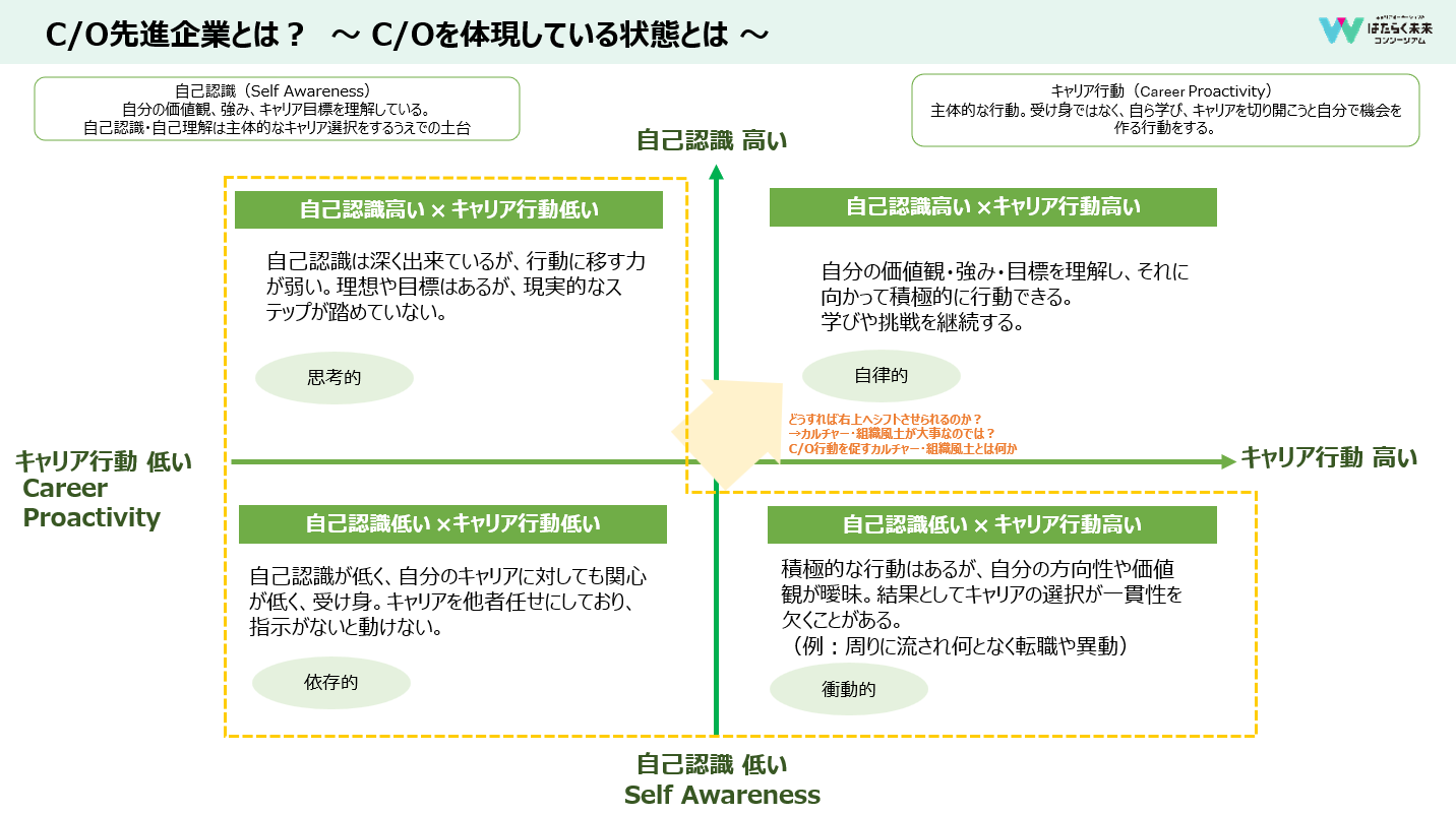 こちらが、キャリアオーナーシップを体現している状態を表すための4象限です。この図の右上の状態が、キャリアオーナーシップを持っている企業がキャリアオーナーシップ先進企業であると考えて動きました。
