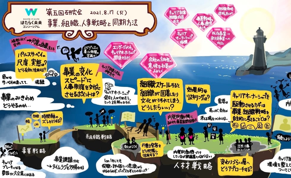 2021年8月17日、4月より発足した「キャリアオーナーシップとはたらく未来コンソーシアム」の第5回 研究会が開催。第5回 研究会では、第4回に引き続き参画各社の『現場の声』を集約するべく、コンソーシアムが独自制作した「事業の変化と人事活動を同期するための棚卸しシート」を用いて、残り4社による「事業・組織・人事の戦略と同期方法」の報告を行いました。なお、こちらのシートのフォーマットは、皆様に活用いただけるよう、研究会の成果の1つとして公開しています。