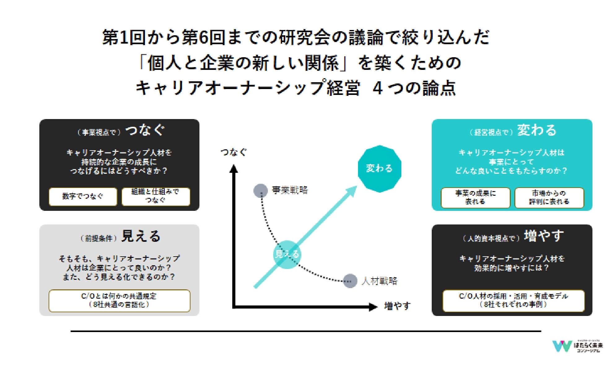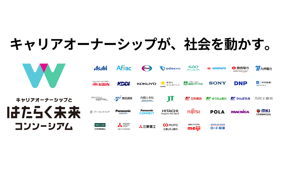 2021年4月20日、「個人の主体的なキャリア形成が、企業の持続的な成長につながる」という考えの下、業種や業界を越えて「はたらく個人と企業の新しい関係」を模索する企業8社が集まり、「キャリアオーナーシップとはたらく未来コンソーシアム」が発足。本コンソーシアムで、社員のキャリアオーナーシップを育む人材戦略を経営戦略の中に位置付け、キャリアオーナーシップ人材を育てようとする企業を増やし、個人と企業が互いの成長に貢献し合う関係性へ変えていくために、研究会や制度の実践・実証といった活動が始まりました。