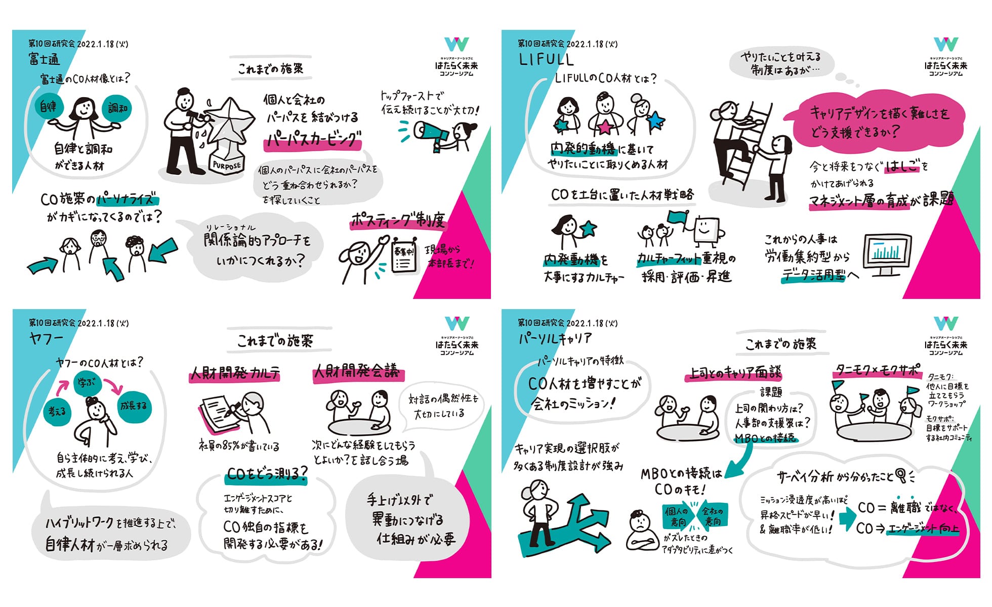 2022年1月18日、「キャリアオーナーシップとはたらく未来コンソーシアム」の第10回 研究会が開催。第10回 研究会では、第9回に引き続き各社に作成いただいたキャリアカルテを発表いただき、参画企業同士でのディスカッションを実施しました。