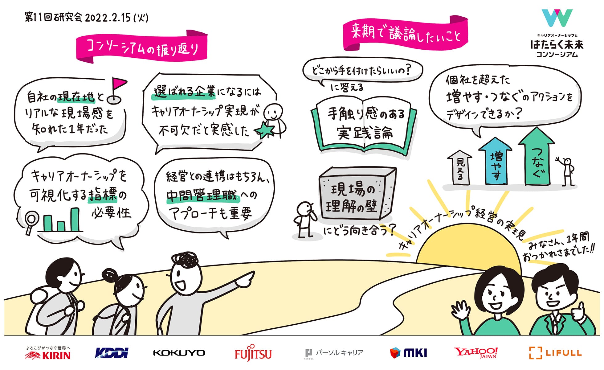2022年2月15日、「キャリアオーナーシップとはたらく未来コンソーシアム」の第11回 研究会が開催。いよいよ3月の今期最終回も迫った第11回 研究会では、参画企業8社がそれぞれのグループに分かれ、当コンソーシアムで今期何を学び、これからそれぞれの実務でどう活かしていくのか、そして来期のコンソーシアムではどのようなテーマに取り組んでいきたいかについて、ディスカッションとプレゼンテーションを実施しました。