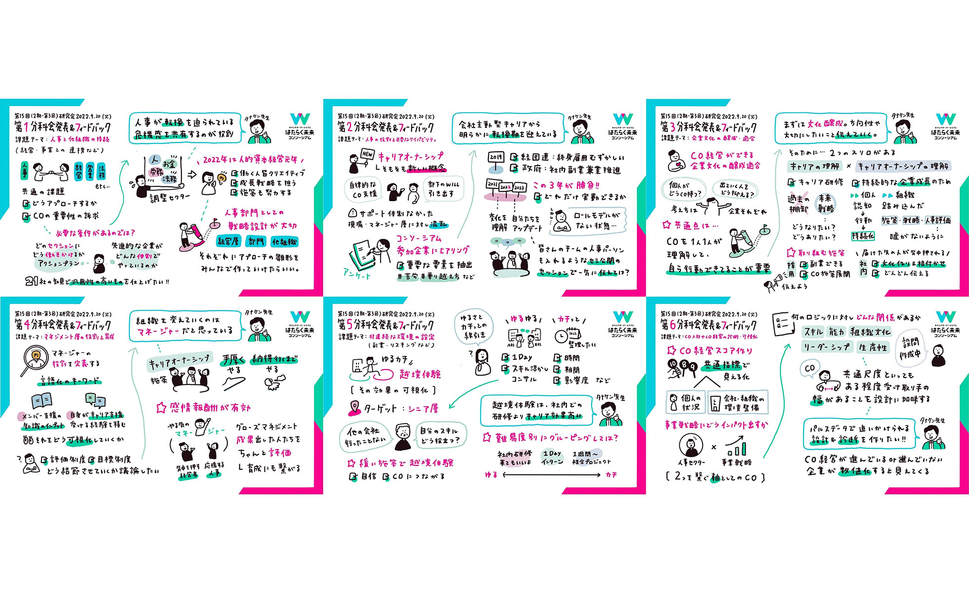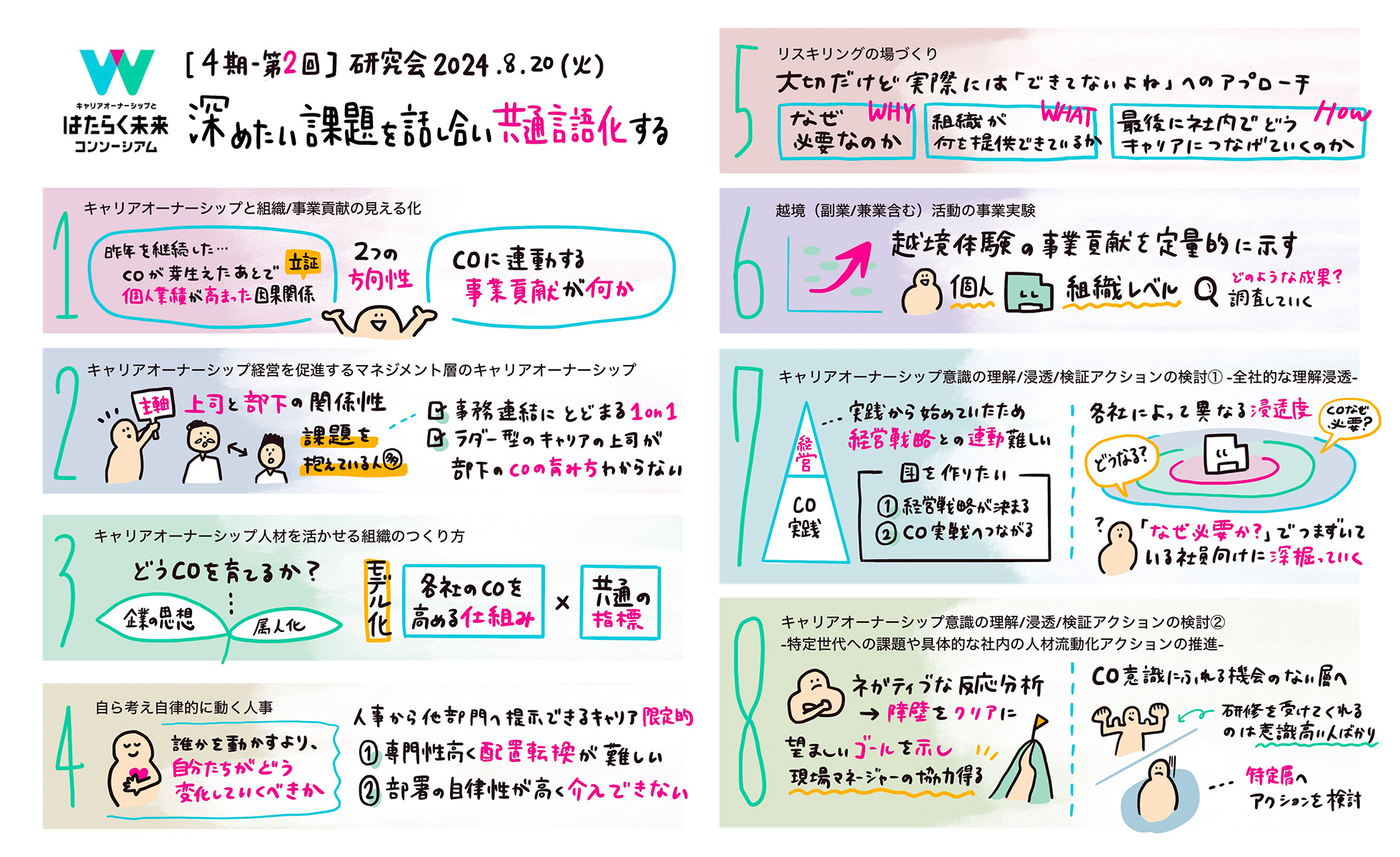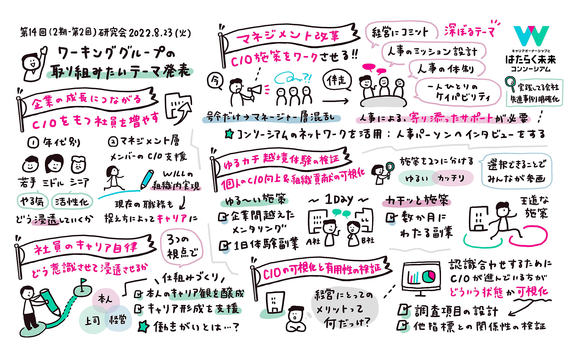 2022年8月23日、「キャリアオーナーシップとはたらく未来コンソーシアム 第2期」の第2回研究会が開催されました。第2回は、約1カ月間、5つのワーキンググループに分かれて、「今後、参画企業同士で話し合いたい、キャリアオーナーシップ人材を活用し、企業の中長期的な成長を生み出していく人的資本を最大化する実践方法の準備・実装・検証に関する課題テーマ」について議論した内容を、お互いに発表し、今後深ぼっていく課題テーマを6つに絞り込みました。