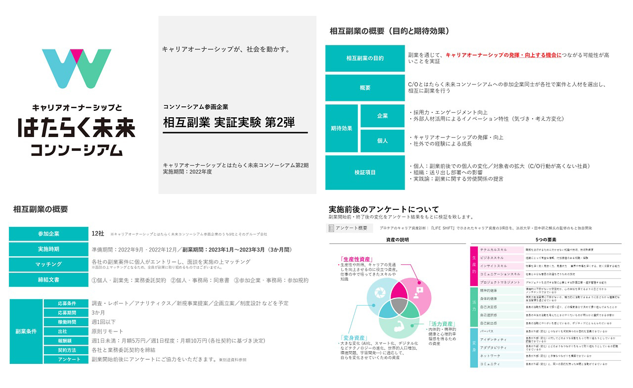 「キャリアオーナーシップとはたらく未来コンソーシアム」では、2022年2月1日(火)から、コンソーシアム参画企業間での「相互副業実証実験」を開始しました。本実験では、副業によって個人と組織それぞれの成長を促すことができるかを検証します。
