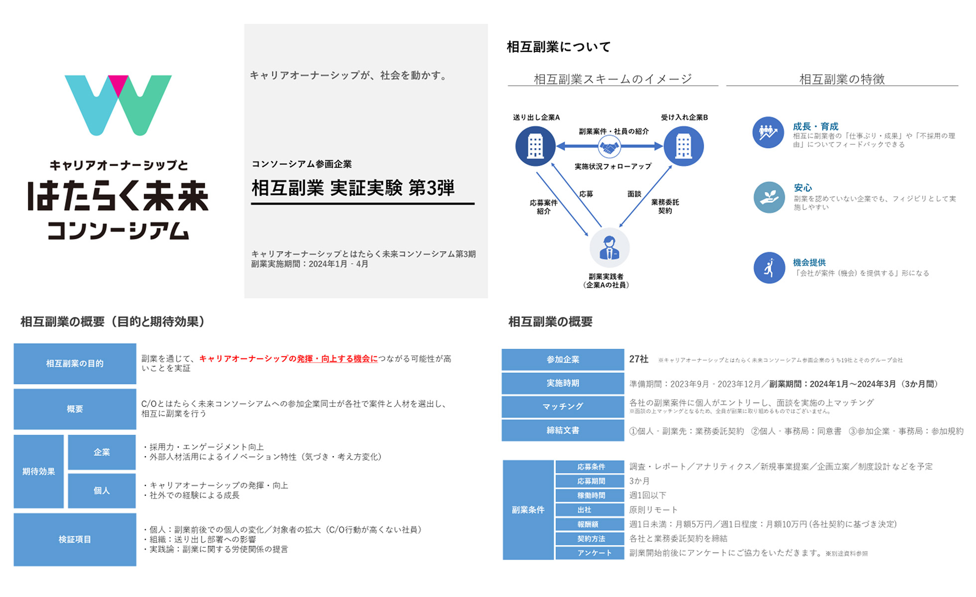 日本を代表する38の企業と団体が集まり、2023年から1年を通して行われた「キャリアオーナーシップとはたらく未来コンソーシアム 第3期」の一環として、相互副業実証実験が実施されました。「相互副業実証実験」とは、参画企業の本格的な副業人材を活用すべく、企業や部署を超えて社員に副業を経験してもらい、その効果を検証する試みです。