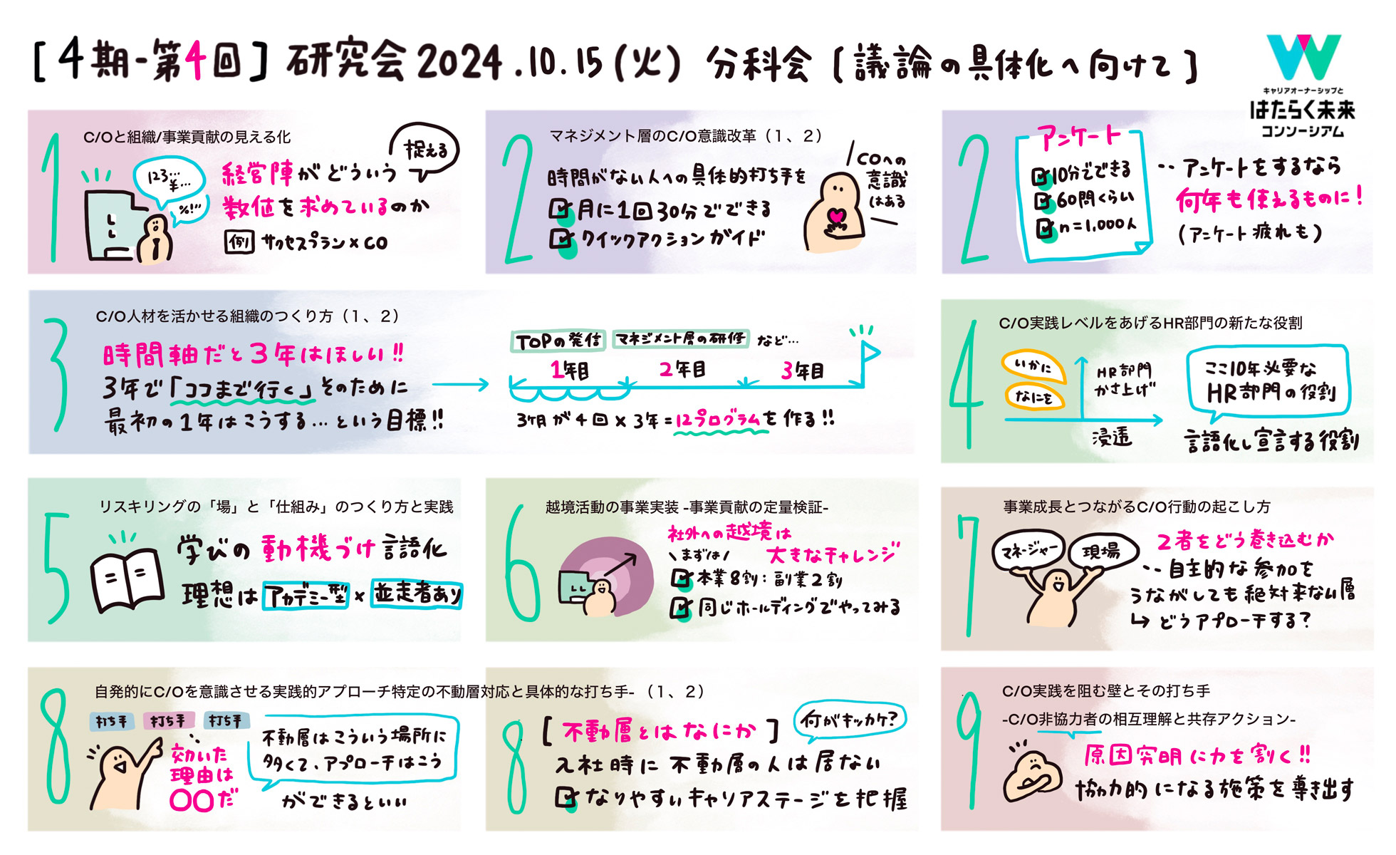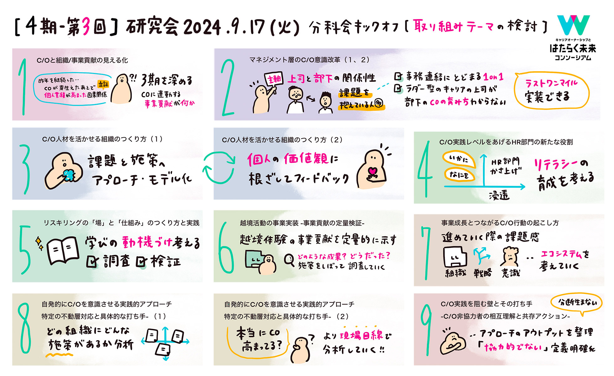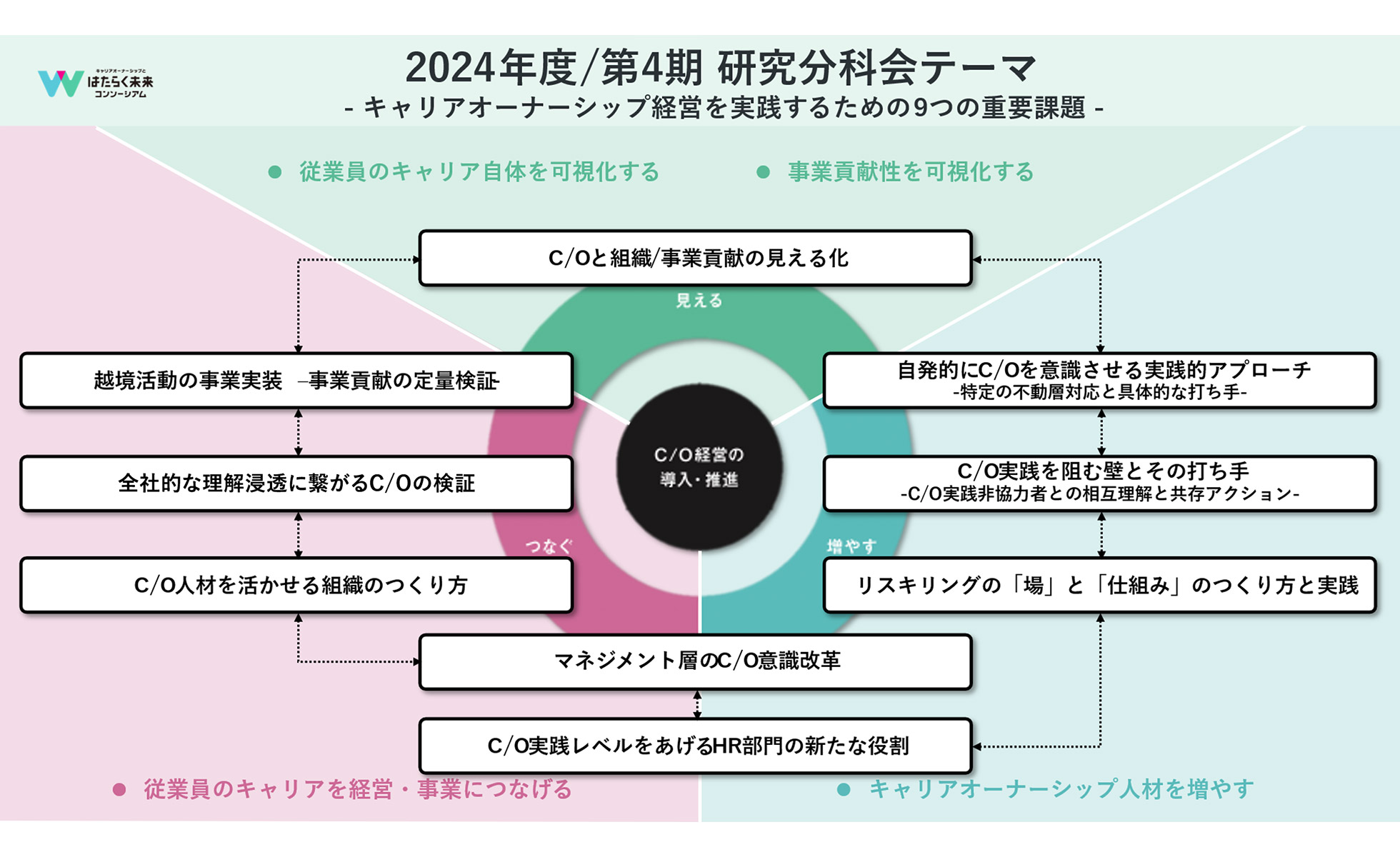 第4期(2024年度)に当コンソーシアム参画企業で話し合う「キャリアオーナーシップ経営」を実践するための9つのテーマが決定しました。