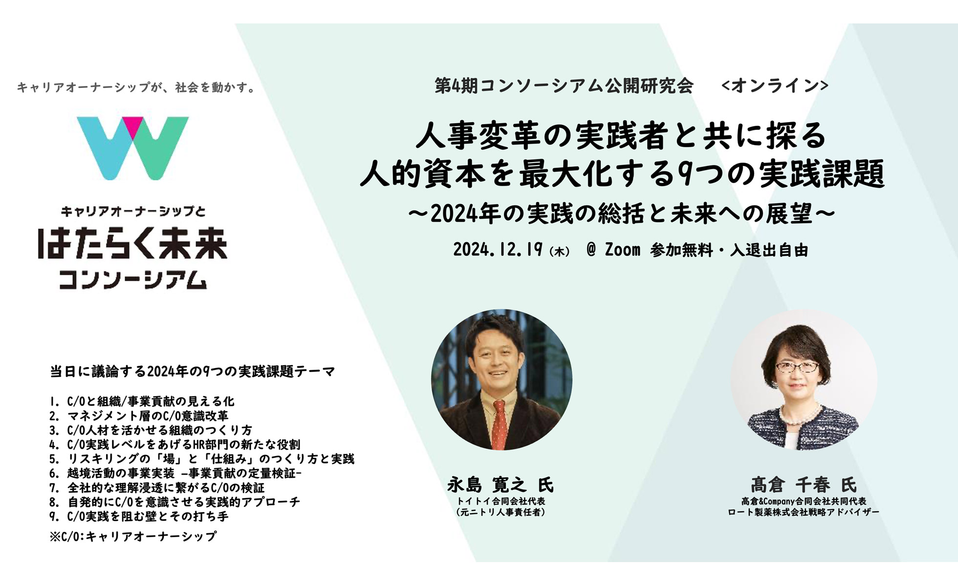 日本を代表する48の企業と団体が参画する「キャリアオーナーシップとはたらく未来コンソーシアム 第4期」の公開研究会が、2024年12月19日(木)に開催されました。