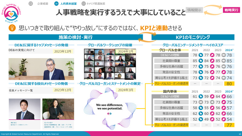 伊藤審査委員長は、「エーザイ株式会社は、人的資本経営の文脈において既に世界水準のレポーティングを行っており、さらに“キャリアオーナーシップ”という観点でも先進的な取り組みを進めている。特に、社員一人ひとりが会社に依存するのではなく、“会社を活用する”という意識変革を促す仕組みや支援体制を整え、成熟社会におけるキャリアのモデルを提示している」と評価しました。