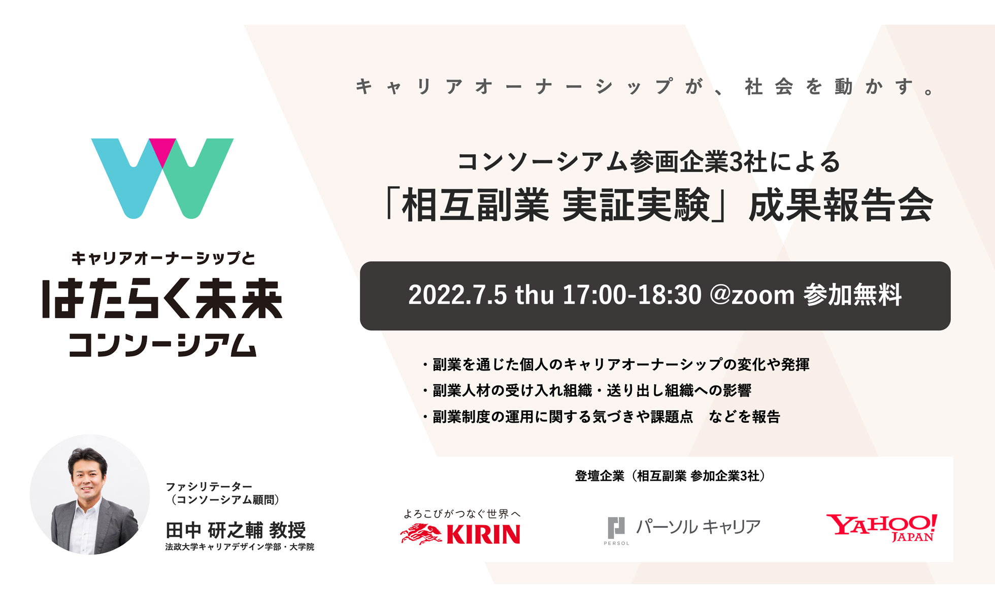 報告会では、今回の相互副業に参加したヤフー、キリンホールディングス、パーソルキャリア、それぞれの本プロジェクト推進担当者が登壇し、副業を通じた個人のキャリアオーナーシップの変化、副業人材の受け入れ組織・送り出し組織への影響、副業制度の運用に関する気づきや課題点などを報告します。