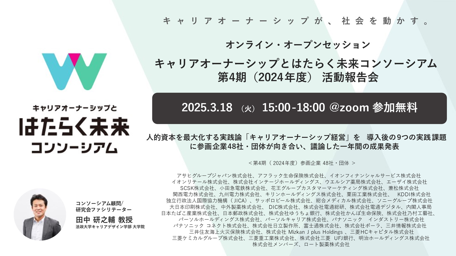| ファシリテーター | 法政大学キャリアデザイン学部・大学院 田中 研之輔 教授 (コンソーシアム顧問・ファシリテーター) |